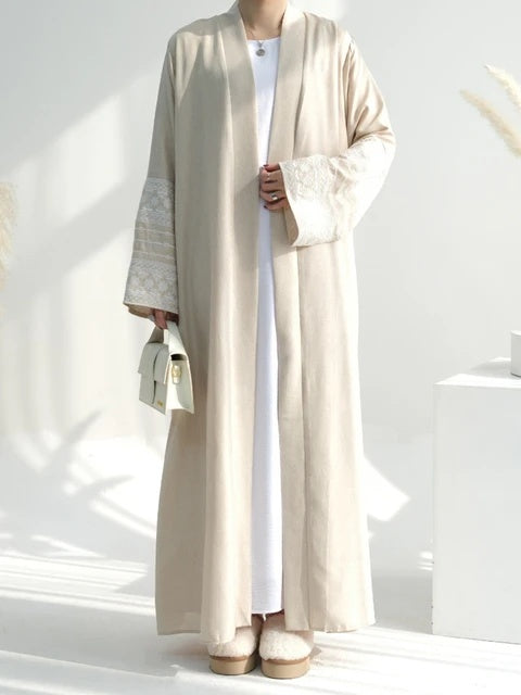Open Abaya With Embroidered Sleeves - Beige