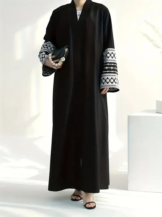 Open Abaya With Embroidered Sleeves - Black