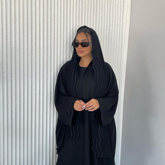 Decorative Open Abaya With Matching Hijab - Black