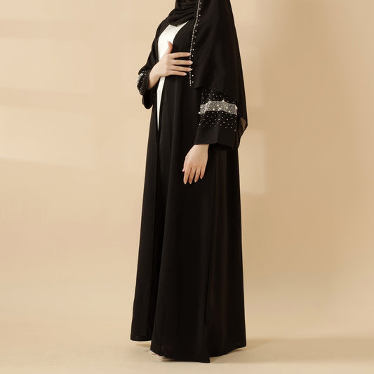 Plain Open Abaya with Beaded Sleeves - Black