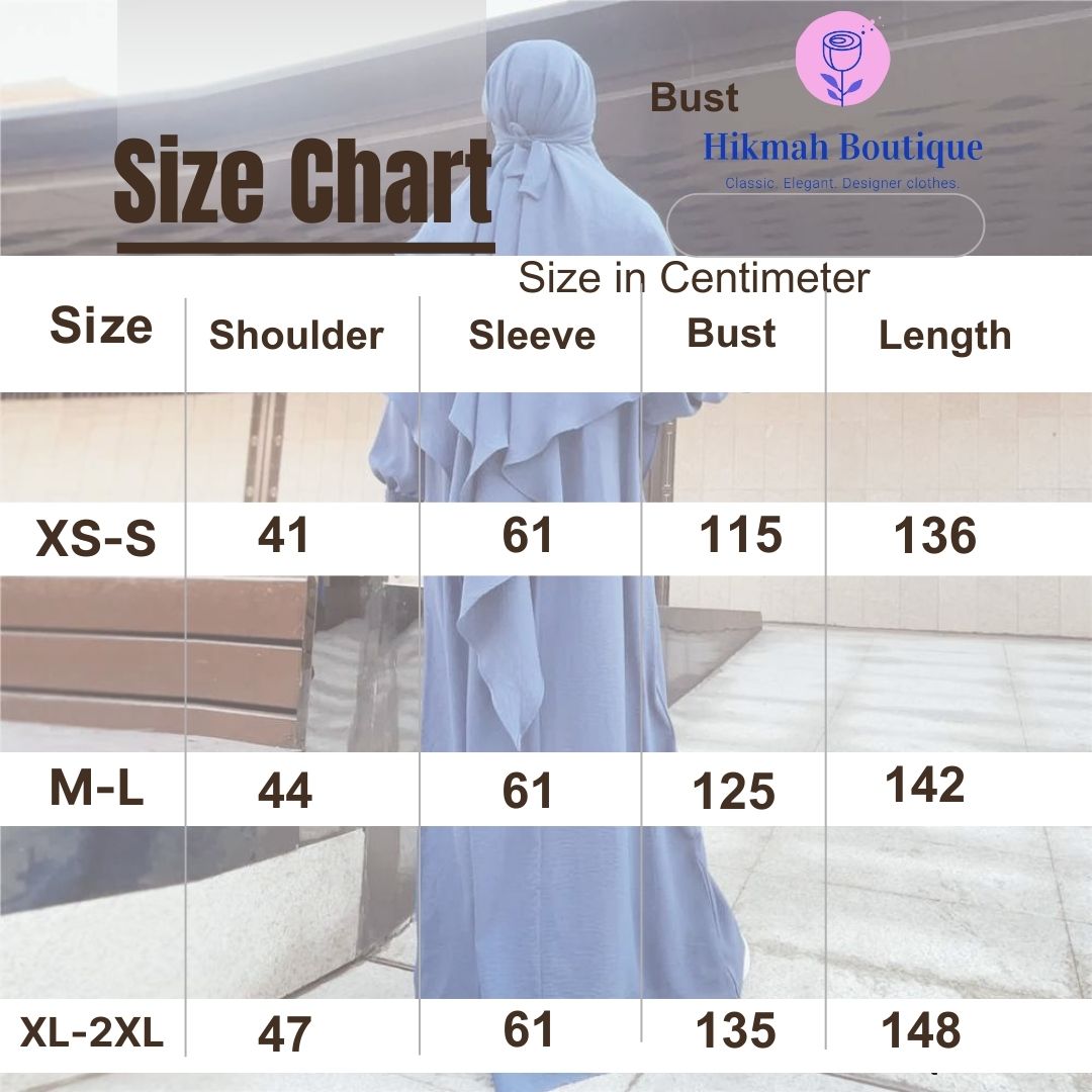 Conclusion: Step into the elegance of the sky with the Sky Blue Crepe Crinkle Abaya with Double Layer Khimar Set from Hikmah Boutique. Embrace the tranquility of the sky blue hues, intricate designs, and the luxurious feel of premium crepe fabric. Elevate your wardrobe with this exclusive ensemble that seamlessly marries tradition and contemporary style. Shop this exquisite piece today and redefine elegance on your terms under the boundless sky.